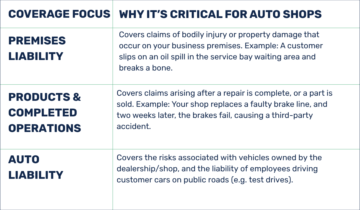 Think of Garage Liability as your general defense shield. It replaces standard General Liability insurance, which would otherwise exclude auto-related business risks.