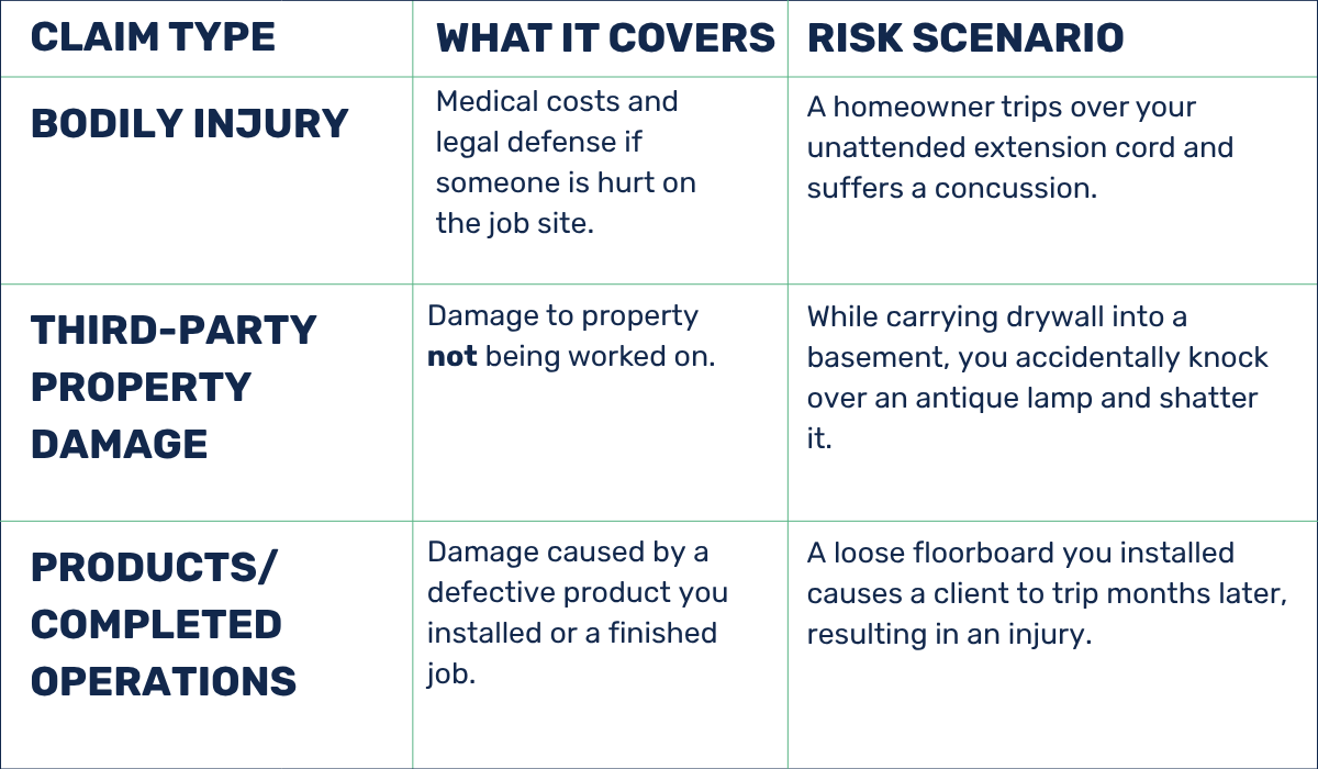 The biggest danger for any handyman comes from working directly on someone else’s property. Your insurance must address three distinct types of claims that can lead to catastrophic financial loss: